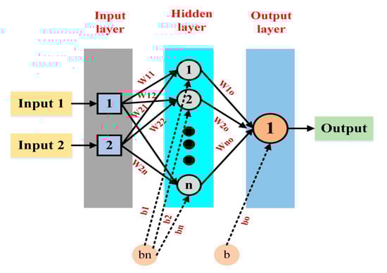 The input layer, hidden layer, and output layer make up the three primary layers of the multi-layer feedforward ANN, as depicted in Figure 8. Those layers are connected through neurons based on weights and biases. The values of the summation weights and biases are distributed and calculated mathematically using Equation (36):