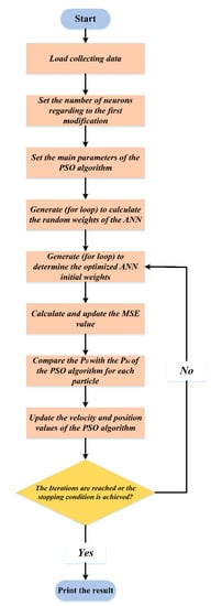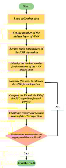 This procedure is continued to the iteration end until the PSO optimiser finds the best solution. In this work, the PSO algorithm is used to find the best topology of ANN structure and then the optimal primary weightings of ANN structure are addressed consequently.
