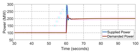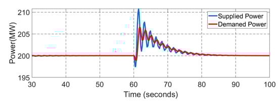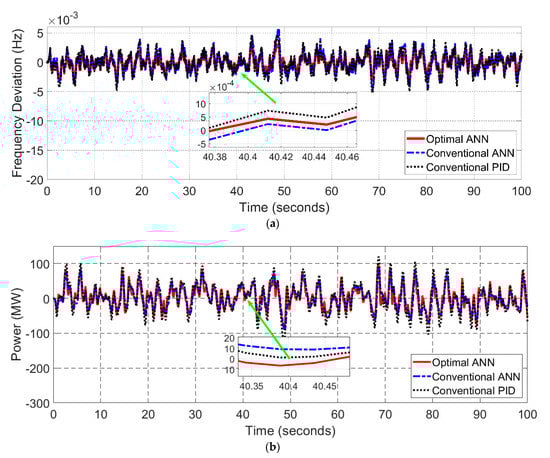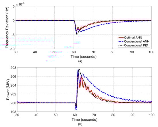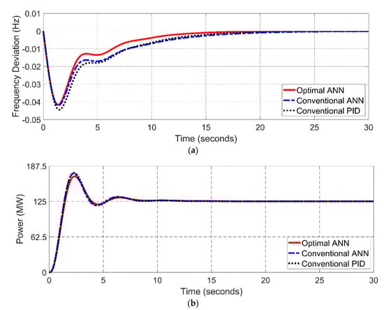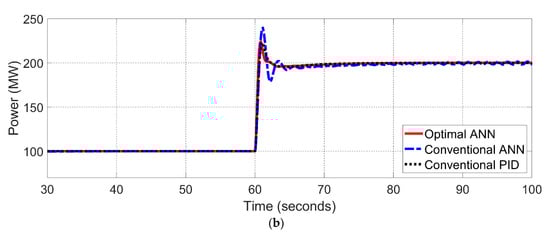 In the first scenario, the step load disturbance, which has been applied on the single-area power network, is rapidly changed from 0% to 50% at 0 s, while the load demand is changed from 0 MW to 125 MW. As seen in Figure 13a, the frequency response of the LFC system utilizing the optimal ANN methodology is the most reliable when compared to the traditional methods for the ANN and PID controllers due to its quick processing time. In addition, compared to the traditional ANN and PID approaches, the transient state’s convergence time for the frequency response is the shortest. While the output delivering power of the system has the least overshoot. Whereas the power of the conventional ANN and conventional PID controllers have a higher overshoot, as presented in Figure 13b. In addition, it proves that the proposed method is able to adjust the power delivery when the mismatched power between the supplied value and demanded value is regulated precisely as shown in Figure 14. However, the effect of the proposed controller is not shown clearly when it is applied on the single-area PSN due to its lower non-linearities of various components of the power system compared with the multi-area PSN.