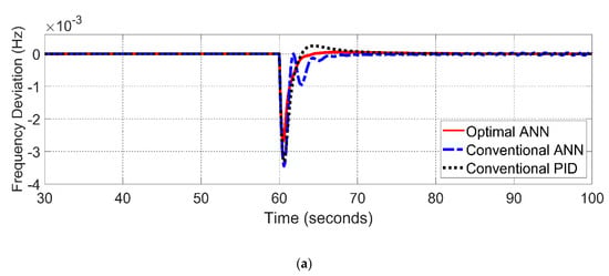 The frequency deviation of a LFC for a two-area PSN based on numerical results for optimal ANN compared with conventional ANN and conventional PID for; (a) Area-1, (b) Area-2.