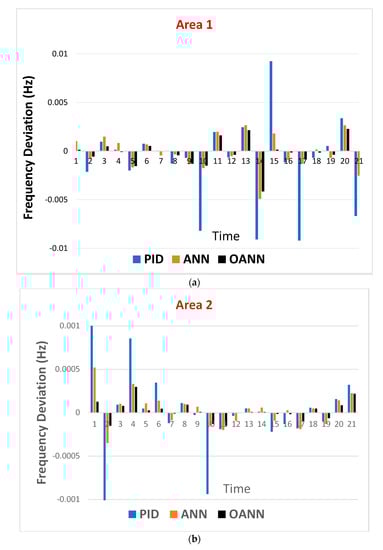 In the second scenario, the optimal ANN controller is applied on two-area power networks instead of a single-area power network. The step-load disturbance is changed from 10% to 20% at 60 s which is accrued in the second area power system, while the load demand is changed from 100 MW to 200 MW. As shown in Figure 15a,b, the results of this scenario confirm that the optimal ANN controller enhances the performance of the frequency response and the power delivery when it mimics the overshoot, avoids the oscillation and reduces the transient time compared with the conventional ANN and PID controllers under various state conditions. In addition, it achieves the regulated state between the supplied power and demanded power of Area-1, as shown in Figure 16. However, the proposed method does not quickly avoid the damping oscillation for the second power system because it happens directly in this section of the power network, as presented in Figure 17. Whatever, it also achieves the regulated state between the supplied power and demanded power of Area-2, as shown in Figure 18. To show the validation of the optimal ANN (OANN) clearly, several operating conditions are collected and analysed based on Table 7 and Figure 19. Regarding this, the proposed method addresses the variations of the frequency system under different state conditions.