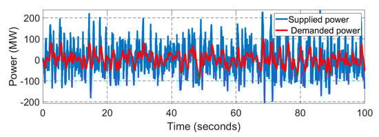 where Ω(s) is the speed of the synchronous generator, H is the inertia of the synchronous generator, ΔPm is the historical change of the mechanical power, and ΔPe is the historical change of the electrical power. Moreover, the modelling of the load demand is represented based on Equation (2):