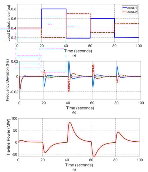 To test the validity of the optimal ANN controller under a fault condition, a third scenario is designed. This scenario is proposed based on the unbalanced conditions when the step load disturbance is changed randomly with a power amplitude signal of 0.05 pu and a frequency scale variation of 50 (rad/s), while the load demand is changed randomly between 10 MW and 100 MW. As noticed from the zoomed-in section in Figure 20, the proposed method is the most accurate to address the optimal steady state value of frequency respace and power delivery compared with the conventional ANN and PID methods under various state conditions, being close to zero frequency deviation. Moreover, it demonstrates that the proposed method is able to adjust the power delivery under the fault condition due to the regulation of the mismatched power of the supplied value and demanded value as shown in Figure 21. However, it drifts away from zero point at the negative side. This is because the system was in an unbalanced state when we simulated the step load disturbance, and changed randomly for the fault condition. Finally, the optimal ANN controller is tested under an unmatched load demand to assess it at a randomly slight time change. The simulation started with 0.4 pu for Area 1 and Area 2, then the first area disturbance is changed to 0.8 pu, 0.2 pu, 0.6 pu, 0.2 pu, at 20 s, 40 s, 60 s, 80 s, respectively, while the second area disturbance is changed to 0.2 pu, 0.7 pu, 0.3 pu, 0.5 pu, at 20 s, 40 s, 60 s, 80 s, respectively. As shown in Figure 22, the frequency responses of Area 1 and Area 2 were reliable to avoid these random load disturbances when it was changed nonlinearly at various times. In addition, the tile line power of the PSN was stable at different states. To access the proposed method numerically, an integral of time multiplied absolute error (ITAE) formula is used (42) [14];