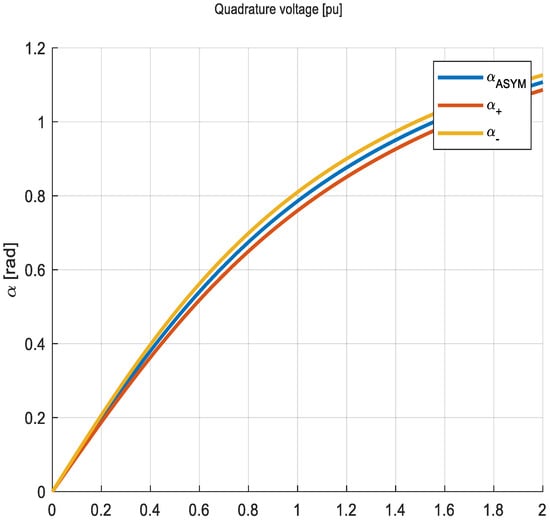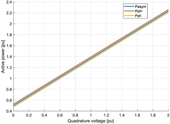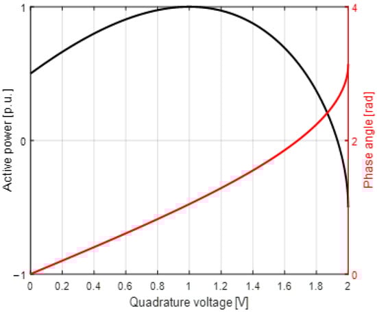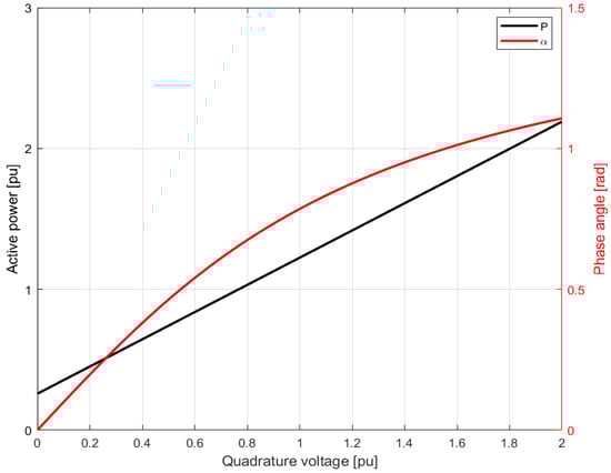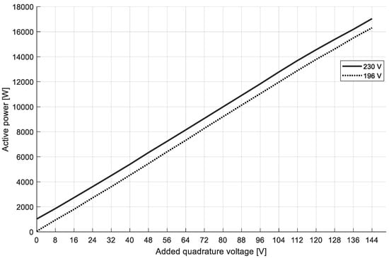 Figure 3 presents the active power flow versus injected quadrature voltage. When the longitudinal voltage is higher than the nominal (105% Un—red case), the total active power transfer is also higher by approximately 5%, which directly results from Equation (7). The angle α range is presented in Figure 4.