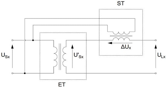 Figure 5. The ACPST single-phase equivalent scheme. ET—extra transformer responsible for longitudinal voltage regulation, ST—series transformer implementing quadrature voltage into the line, USx—input voltage of any phase, U’Sx—regulated longitudinal voltage of any phase, ΔUx—quadrature voltage injected into the line, ULx—PST output voltage of any phase.