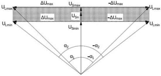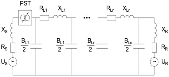 where UL is the PST output voltage, UR is the end line voltage, X is the longitudinal reactance, δ is the nominal phase angle between both lines’ ends, and α is the additional phase angle implemented by the PST.