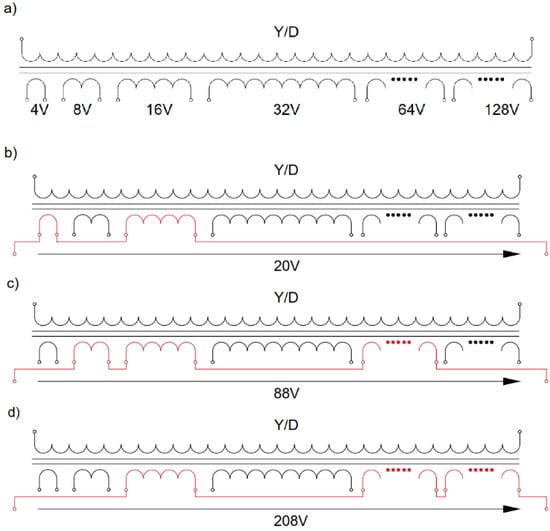 Figure 7. Some possible connections of the ST secondary windings in a single-phase equivalent: (a) The base set, (b) 20 V quadrature voltage, (c) 88 V quadrature voltage, (d) 208 V quadrature voltage.