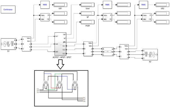 In Figure 9, the PST’s basic simulation set in Simulink is shown. Depending on the considered type, a different PST connection was implemented in the subsystem called “ACPST/APST/SPST”.