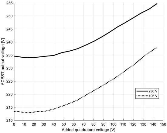 Figure 11. ACPST output voltage versus added quadrature voltage for two cases of longitudinal voltages (230 V—continuous line, 196 V—dotted line).