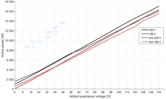The laboratory tests were performed for the cases of longitudinal voltage U’S equal to 196 V and 230 V (line-to-line voltage 340 V and 400 V, respectively). The line length was set as 22 sections. The comparison of the obtained active power flows for 196 V and 230 V longitudinal voltage during laboratory measurements is presented in Figure 10.