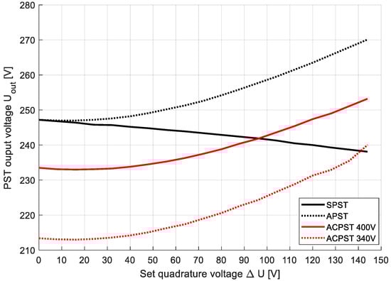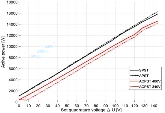 Both SPST and APST guarantee the highest active power flow for the same set quadrature voltage. This is a result of both systems’ nominal voltage values, because both SPST and APST operate on the natural voltage conditions in the system. The ACPST case works in the lowered or nominal line voltage, so these values are lower than in the rest cases. This fact is confirmed in Figure 14, representing output voltage waveforms for all cases.