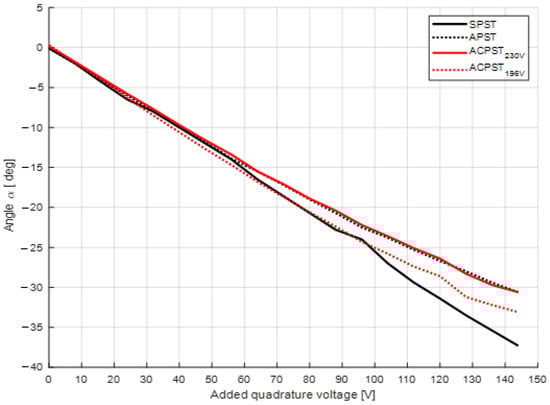 For all PST devices considered in this research, the obtained angles α are relatively small. The maximum value for the SPST case was equal to 37°. This fact does not allow us to check the real angle curves because theoretical angle waveforms are prepared in a broader range of angles. Figure 15 shows the angle values for the injected quadrature voltages from 0 to 144 V.