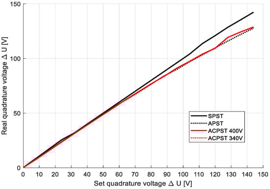 The ACPST 230 V case and APST have very similar courses. The ACPST 196 V case shows that lowered longitudinal voltage allows for obtaining higher angle values, which confirms the theoretical assumption. The highest angle α is obtained for the SPST type; however, this dependency is visible for quadrature voltages greater than 100 V. This fact is connected to the voltage drops in the ACPST impedance, which is higher than in the SPST. The confirmation of this thesis is presented in Figure 16. The real quadrature voltage versus the set quadrature voltage clearly shows that SPST can maintain the real voltage injected into the line. For a maximum set value of 144 V, there is a 2 V drop, and the real quadrature voltage is equal to 142 V. In contrast to SPST are all the asymmetrical PSTs. Above a set quadrature voltage of 60 V, the voltage drops are higher than in the SPST case. For the maximal set quadrature voltage, the real quadrature voltage is 130 V for the ACPST type and 128 for the APST.