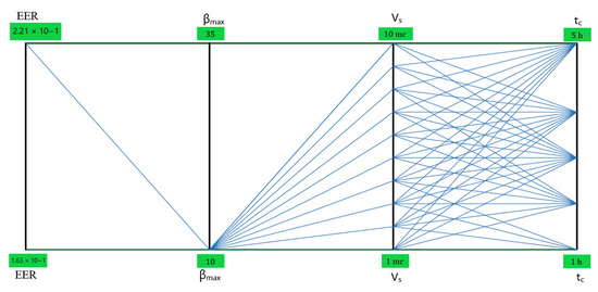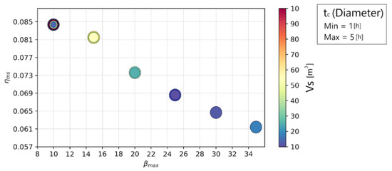 For the maximum compression ratio () the lower limit of 10 was chosen, since for pressures below 10 bar the air compression has insignificant temperature variations, which would not justify the installation of the HTTES system. The upper limit, on the other hand, was taken to be 35, because the datasheets of manufacturers of reciprocating compressors show that with a maximum installed motor power of 3 kW (equal to the nominal power of the photovoltaic system) it is possible to compress air up to a maximum of 35 bar. The storage volume of the compressed air () had an upper limit of 10 m3 for space and cost reasons. Finally, the duration of the charging phase of the CAES () must be consistent with the hours during which the solar photovoltaic system can operate during the day; for this reason, the upper limit of 5 h was set. The possible values assigned to each input variable result in up to 300 different experiments to be conducted.