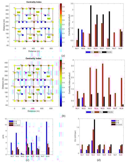 Centrality analysis of combination C1 (a) for scenarios S1-A and S1-B, (b) for scenarios S1-C and S1-D along with (c) shelter to population ratio (SPR) and (d) energy use index (EUI).