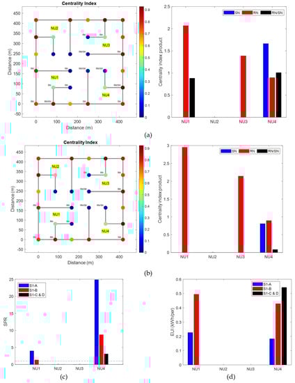 Centrality analysis of combination C4 (a) for scenarios S1-A and S1-B, (b) for scenarios S1-C and S1-D along with (c) shelter to population ratio (SPR) and (d) energy use index (EUI).