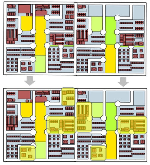 Updated layout of C1 based on observations during resilience analysis (movement of buildings highlighted in yellow blocks).