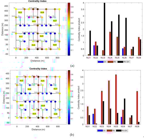 Centrality analysis of combination C1 (a) for scenarios S1-A and S1-B, (b) for scenarios S1-C and S1-D with updated layout.