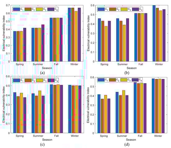Electrical vulnerability analysis of NU combinations for (a) S1-A, (b) S1-B, (c) S1-C, and (d) S1-D scenarios.