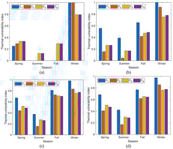 As represented in Figure 9a, the thermal vulnerability for the S1-A scenario is good for the spring, summer, and fall seasons. For example, in summer and fall NU combinations C1 and C2 are non-vulnerable in case of any natural gas outage. This is due to less thermal demand in these seasons. Some vulnerability is apparent in the spring season, whereas in winter C1 and C2 are highly vulnerable due to greater thermal demand and less onsite thermal energy availability. Due to this fact, these combinations (C1 and C2) are fully vulnerable (i.e., not for a single hour 100% thermal needs can be fulfilled). The thermal vulnerability index of C3 and C4 is also comparatively high in winter (close to 0.8). Similarly, in Figure 9 the thermal vulnerability analysis is extended for other natural gas outage scenarios as well (S1-B, S1-C, and S1-D).