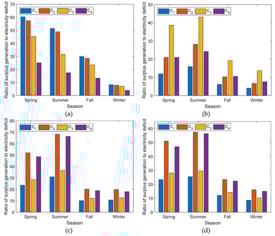 Nevertheless, the NU combinations are still electrically vulnerable as indicated in Figure 8. This paper further estimates the ratio of surplus generation to electricity deficit for the given time period under each evacuation scenario (S1-A, S1-B, S1-C, and S1-D) as presented in Figure 10. Interestingly, the surplus generation to electricity deficit (SGED) ratio is well above 1 for all NU combinations under various scenarios and seasons (1 can be interpreted surplus generation equivalent to electrical deficit). For instance, in scenario S1-A, the SGED ratio is maximum for C1 and minimum for C4 in all seasons. Intuitively in the winter the SGED ratio is minimum due to less onsite generation because of reduced number of sun hours.