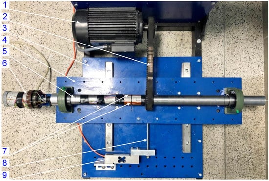 The rotational-motion-setting system consisted of a belt transmission and an asynchronous motor equipped with a frequency inverter. The rotational speed of the motor, which drove the belt transmission, was controlled by the frequency inverter. The belt transmission generated a rotational speed of the shaft in a range from 1 to 20 rps. The load-setting system consisted of a screw gear mechanism, which caused changes in the values of the force acting on the shaft. Screwing in or screwing out caused an increase or decrease in this force. This system generated force, which acted on shaft, in a range from 0 to 1000 N.