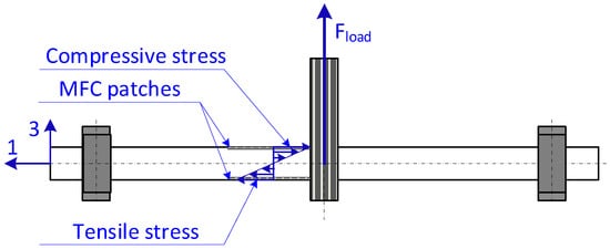 The two-component X-60 adhesive, manufactured by Hottinger Baldwin Messtechnik GmbH, was used to glue the MFC patch on the shaft surface. X-60 adhesive does not contain plasticizers, thanks to which stresses in the glued MFC patch should be equal to the stresses which are in the shaft. Variable stresses in the shaft were generated by the simultaneous operation of the load-setting system and the rotational-motion-setting system. The load-setting system caused a generation of tensile stress along 1 axis in one side of the shaft and compressive stress along 1 axis in the second side [