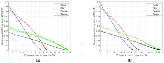 35]; (2) in the parallel and delta connections the output voltage is approximately equal to the voltage generated by one MFC patch (assuming that all MFC patches generate the same voltage values); (3) in a series connection, the voltages add up; and (4) in a star connection, the average current is calculated as: