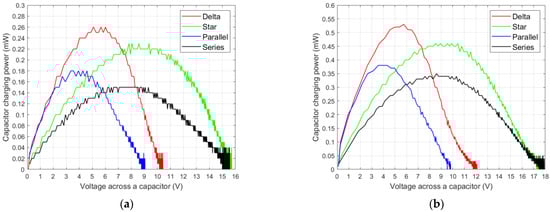 The star connection generated the highest values of average charging electrical current, and the other connections can be ranked according to the decrease in the average value of the generated charging electrical current in the following way: series, delta, and parallel. The star connection generated an average charging current greater by 9.68% compared to the series connection, greater by 64.47% compared to the delta connection, and greater by 95.33% compared to the parallel connection. As a result, the star connection makes it possible to obtain the highest values of voltage across a capacitor in the long time period. However, the delta connection produced the highest capacitor-charging power and the other connections can be ranked according to the decrease in the average value of the generated capacitor-charging power in the following way: star, parallel, and series. The delta connection generated an average charging current greater by 11% compared to the star connection, greater by 33.66% compared to the parallel connection, and greater by 47.71% compared to the series connection.