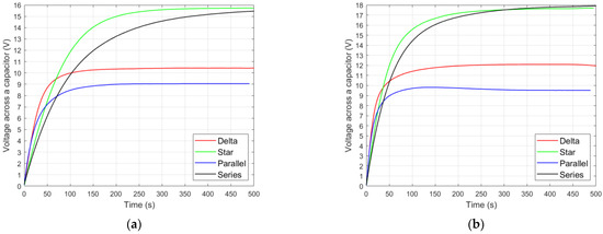 Parallel and delta connections generate lower voltages than series and star connections, so the larger the voltage across the capacitor, the more frequently there are discharge times for the capacitor. The series and star connections generate higher voltages, so there will be a lower sum of discharge times for the capacitor. It should also be noted that the use of a three-phase rectifier in the star connection causes the output voltage in this connection to show less instantaneous drops compared to the series connection. The star connection generated the greater values of average charging electrical current in comparison to the rest of connections, appropriately greater by 9.68% compared to the series connection, greater by 64.47% compared to the delta connection, and greater by 95.33% compared to the parallel connection. As a result, the star circuit made it possible to obtain the highest values of voltage across a capacitor in the long time (