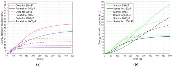 30]. The state of the art is extended by describing the impact of the application of energy-harvesting systems (delta and star) with a three-phase rectifier on an energy storage process in the capacitor, which is charged by these energy-harvesting systems.