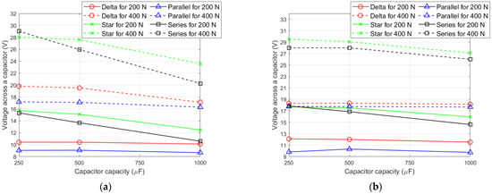 38] noticed that a parallel connection is the most efficient to charge a capacitor for a voltage across the capacitor from 1.8 to 3.6 V. However, what is new is the observation that the shortest times to reach a voltage on the capacitor equal to 3.6 V and 5.2 V were achieved more often by the delta connection than by the parallel. The delta connection always generated voltage equal to 3.6 V or 5.2 V across a capacitor in the shortest time for a lower level of load-force value (200 N). The delta connection generated a target voltage equal to 3.6 V and 5.2 V across a capacitor in an average time shorter, respectively, by 6.25% and 13.76% compared to the parallel connection. For a higher level of load-force value (400 N), the delta and parallel connections generated voltages across a capacitor equal to 3.6 V or 5.2 V in more comparable times. However, the delta connection generated target voltages equal to 3.6 V and 5.2 V across a capacitor in an average time shorter, respectively, by 7.14% and 3.92% compared to the delta connection for a level of stress in the shaft caused by a bending force of 400 N.