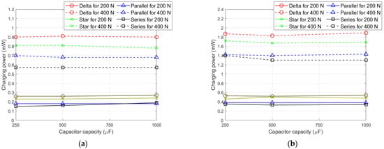 The shortest time to reach voltages across a capacitor equal to 3.6 V and 5.2 V, which are the standard values for commercial EH300 or EH301 energy storage systems, is achieved by use of both the delta and parallel connection. The choice of one of these connections depends on the load conditions of the shaft. The delta connection generated target voltages equal to 3.6 V and 5.2 V across a capacitor in an average time shorter, respectively, by 6.25% and 13.76% compared to the parallel connection for a level of stress in the shaft caused by a bending force 200 N. For target voltages across a capacitor equal to 3.6 V and 5.2 V, the difference between the charging times by the delta circuit and by the parallel connection decreased as the stress in the shaft increased, and, finally, the parallel connection generated a shorter loading time. The delta connection generated target voltages equal to 3.6 V and 5.2 V across a capacitor in average times shorter, respectively, by 7.14% and 3.92% compared to the delta connection for a level of stress in the shaft caused by a bending force 400 N.