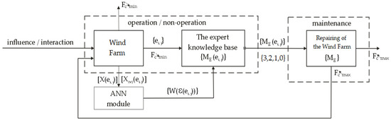 The performance of complicated technical objects utilized in the operating procedure degrades. Their capacity to carry out the necessary (intended) tasks is diminished. The utility problem is referred to as a functional resource in the literature [3,4,5,6,7,8,9]. The deterioration in technical facility dependability, notably that of WF equipment, is intimately related to the loss of operating capacity. Aging and the detrimental effects of external variables are the main causes of the loss in the dependability of technological structures. This makes estimating the current reliability of WF equipment and simulating the operation of complex technological components more challenging. The issue is very complicated when it comes to medical devices, wind farm equipment, and other goods that continuously perform their intended function.