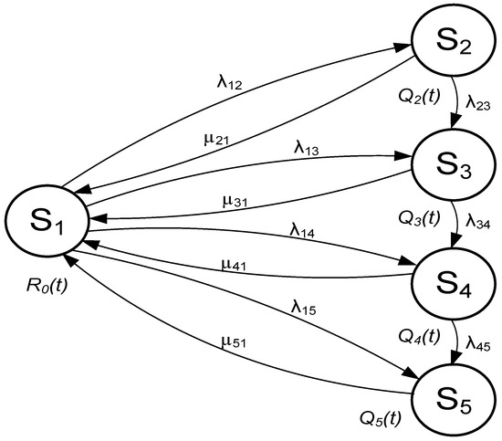 - If the (S1) state experiences damage or a malfunction in the WFD system, the system moves with the intensity of the damage (λ15) to the (S5) state. In state (S5), the efficiency of the WF power system is critically below 100%. In the state (S5, the WFD team is operational in the minimum (critical) range. The function required by the WFD is performed to a limited extent, this is the pre-fault condition. In the state (S5), WFDs are subject to essential (primary) repairs if the transition to this state was caused by a malfunction. Then WFD with repair intensity (µ51) go to state (S1). In case when the transition of the WFD to the state (S5) was forced by the necessity to perform the required technological tasks from the set of operations (T4). In the state (S5), periodic main technological activities of the WFD are performed. The execution of technological tasks (T4) causes the WFD to move with the intensity of repairs (µ51) to the state (S1). If there is damage to the WFD in the state (S5), then the required corrective actions are performed, and after they are completed, it passes with the intensity of repairs (µ51) to the state (S1).