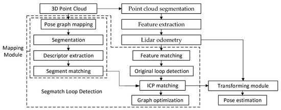 The loopback detection function in the LeGO-LOAM algorithm is achieved by an ICP loopback detection algorithm based on Euclidean distance, which sometimes results in errors or recognition omissions. For this reason, this paper incorporates SegMatch loopback detection with high detection accuracy to improve the loopback detection of the traditional LeGO-LOAM algorithm, and proposes the LeGO-LOAM-SM algorithm for optimized global pose estimation. The block diagram of the improved algorithm is shown in Figure 1.