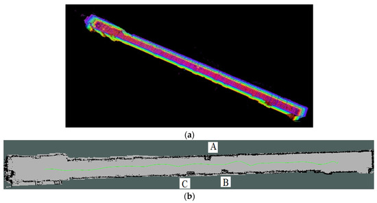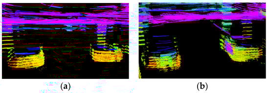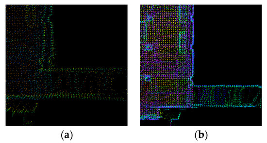 Point cloud map of the KITTI dataset 00 sequence constructed by the LeGO-LOAM and LeGO-LOAM-SM. Color represents elevation: (a) LeGO-LOAM; and (b) LeGO-LOAM-SM.