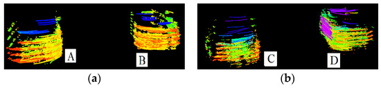 The matching candidates are fed into the geometric verification model by using the random sampling consistency algorithm. The rotation matrix between two point clouds is estimated by splitting the centroid of the point cloud; the matching degree is checked according to the geometric consistency of the corresponding relationship. The consistent geometric information in the delineated point cloud cluster can be regarded as the same object. Figure 3 is a visual effect of geometric verification of extracted descriptors using SegMatch, and colors indicate different point cloud segmentation. It can be seen from the figure that object C and object D in the target cloud correspond to object A and object B in the source cloud and can be regarded as the same object.