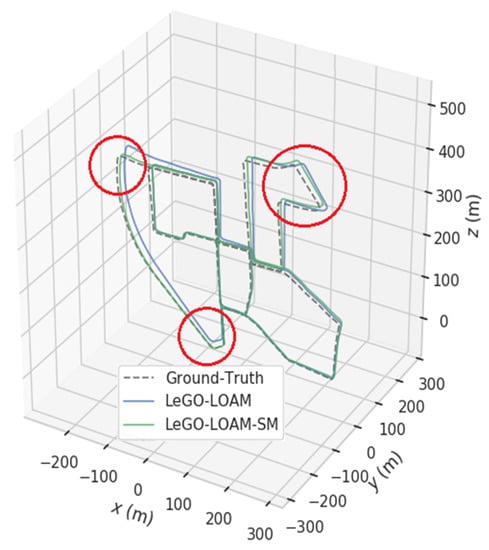 The motion trajectories of the two algorithms were extracted by the evo tool, as shown in Figure 6, and the ground-truth trajectory is also given for the convenience of contrast. It can be seen from Figure 6 that the motion trajectory generated by LeGO-LOAM-SM has a higher degree of coincidence with the ground-truth trajectory, especially at large angle turns (the part circled in red in Figure 6), and that LeGO-LOAM fails to loopback smoothly, while the LeGO-LOAM-SM algorithm has a smoother loopback and better effect.
