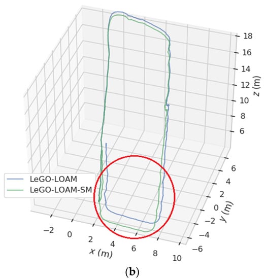 Partial enlarged view of the red boxed section in Figure 9: (a) for LeGO-LOAM; and (b) for LeGO-LOAM-SM.