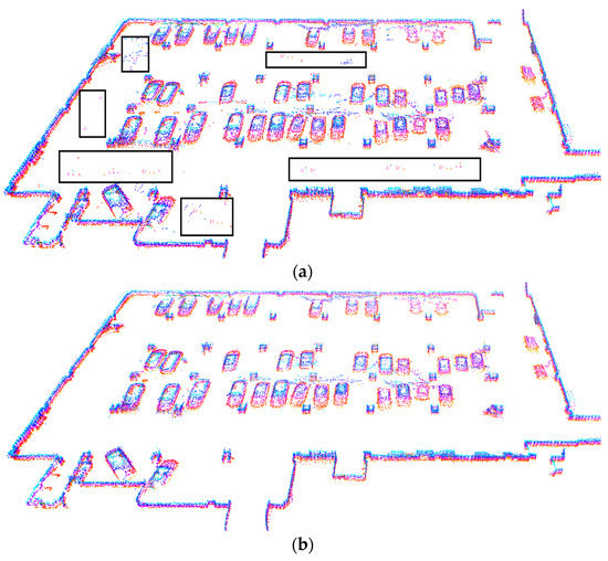Point cloud map constructed for Scene 1: (a) by LeGO-LOAM; and (b) by LeGO-LOAM-SM.