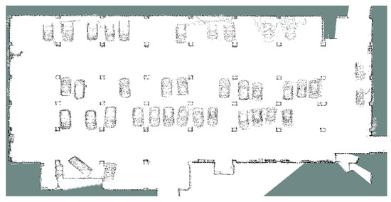 The corresponding 2D occupancy grid map is obtained by projecting the constructed 3D octo-map onto the 2D plane. Compared with the 2D occupancy grid map directly constructed by 2D LiDAR, the constructed 2D occupancy grid map contains the required three-dimensional obstacle information in 3D space instead of 2D obstacle information in the plane where LiDAR is located, which has a better obstacle avoidance effect for the mobile robot driving in the 3D space using the 2D occupancy grid map for path planning and navigation. Figure 14 shows the constructed 2D occupancy grid map of the underground parking lot scene.