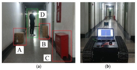 Scene 3: underground coal mine roadway simulated environment and experiment platform: (a) static obstacle and pedestrian; and (b) the whole scene and experiment platform.