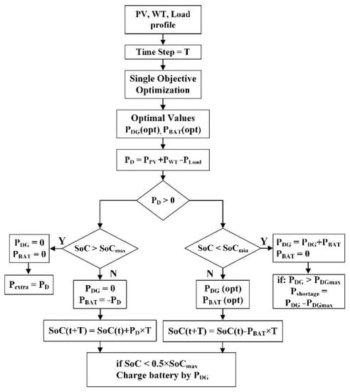 As it can be seen from Figure 4, according to the power amounts of PV, WT, and Load at each time step, a single-objective optimization was employed to obtain the optimal values for DG and BAT considering the constraints in (4)–(7). If the REs meet the load, this difference power (PD) can charge the battery if the battery is not fully charged. On the contrary, if the battery is fully charged (SoCmax), then PD identifies as extra power. In this case, DG is not necessary to produce power to provide the power balance. On the other hand, if the REs are insufficient to supply the load, the DG and BAT participate economically to provide the required power for the load. In this case, the battery discharges if a portion of load demand is supplied by battery power. Supplementary battery management is also provided to check the SoC battery in each iteration. By evaluating the possibility of DG generation, the battery can be charged at least at the level of 50%.