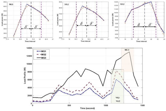 In (9), ||δ+ − δ−|| represents the interval at which PL occurs, at (δ+ + δ−)/2, and the OR of other MGs are also calculated in this interval; therefore, only PL and the maximum load profile (Lmax) are identical if the load patterns are similar. For instant, when the MG1 and MG2 are at PL, the MG3 is not in its PL. In addition, N is the number of MGs that existed in the NHMG, and corr represents the correlation of the load pattern among MGs. The Pearson’s linear correlation coefficient was utilized to evaluate the correlation of the Load profile: