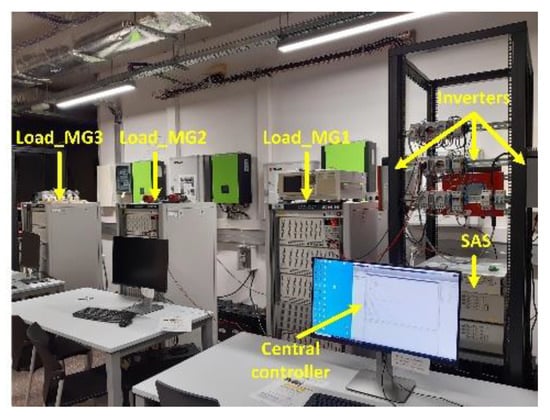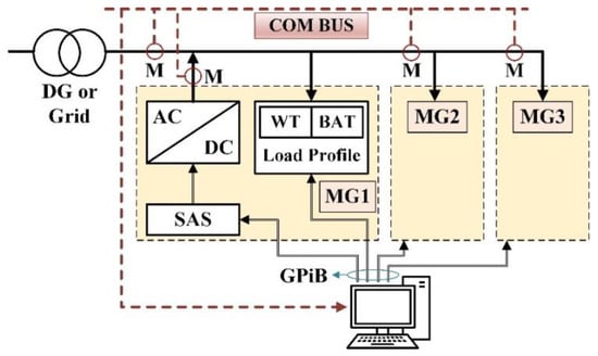 where G is the solar radiation (W/m2), α is modified ideality factor (α = K × Temp/q, where K is the Boltzmann constant, Temp is cell temperature, and q is electron charge), and β is the temperature coefficient. The temperature is considered constant, T = Tref. Figure 9 shows the laboratory experiments’ configuration of the three MGs. Figure 10 represents the optimal operation of the NMG according to the reduced component sizing calculated by the proposed algorithm. As can be observed, the produced energy by the power generator units can meet the load effectively.