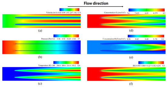 Key variable distribution in the middle plane of cathode flow field for Case 1 design: (a) pressure, (b) velocity, (c) temperature, (d) oxygen concentration, (e) water vapor concentration and (f) relative humidity distribution.