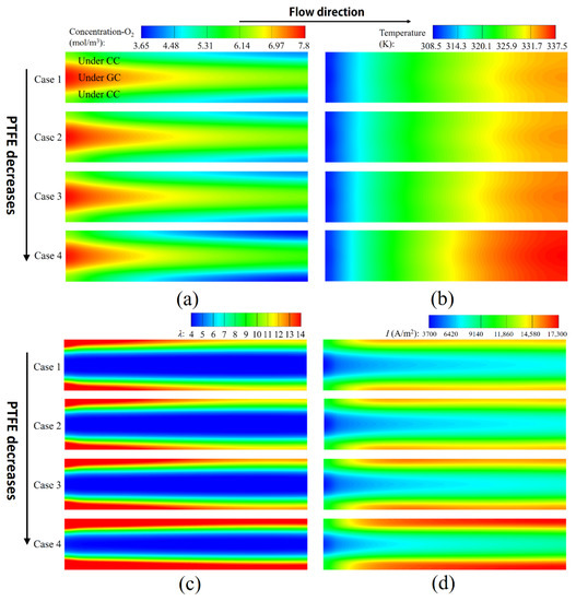 The change of the above physical parameters in the cathode flow field is highly related to the complex transport and chemical reaction processes inside the electrodes. Figure 5a–d respectively compare the distribution of oxygen concentration, temperature, dissolved water content and current density in the middle plane of CCL for the four PTFE uniformly doping schemes in Cases 1–4. For all the cases, along the flow direction, the oxygen concentration decreases as it is consumed by the electrochemical reaction. It can also be found that the oxygen concentration is higher under the GC than that under the CC. The higher mass transfer resistance and faster electrochemical reaction rate under the CC are the main reasons for this phenomenon. Additionally, with the decrease of PTFE content in GDL from Case 1 to Case 4, the oxygen concentration in CCL presents a downward trend, which is due to stronger electrochemical reaction as will be explained in Figure 5d. In Figure 5b, the air continuously absorbs waste heat along the flow direction leading to the temperature rise in the MEA from the inlet to the outlet), and Case 4 with the lowest PTFE content presents the highest temperature. Such a high temperature is expected to render more water evaporated resulting in lower dissolved water inside the CCL. However, the dissolved water distribution displayed in Figure 5c shows the opposite trend. The above result results from the fact GDL with less PTFE doping is characterized with lower hydrophobicity and higher porosity, leading to enhanced water retaining ability of the GDL. With more water retained in the electrodes, the proton conductivity increases, and thus the reaction rate is improved due to the reduction of ohmic loss, leading to more water being generated. In turn by the phase change more dissolved water will be retained in the CCL, leading to the positive feedback between higher water content and stronger electrochemical reaction. Due to this positive feedback, the current density distribution in CCL as shown in Figure 5d is positively related with the distribution of dissolved water. The current density is higher under the rib than that under the channel, and it increases with the decrease of PTFE doping content. Careful observation will also find that the current density near the cathode inlet is lower than that at the downstream. The phenomenon is mainly caused by the insufficient hydration of membrane near the inlet due to a large amount of dry air entering the GC. With the water produced by the reaction accumulating at the downstream, the current density is significantly increased.