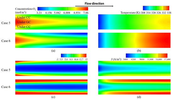 As depicted in Figure 6a, different designs share the similar features of lower oxygen concentration under the rib and downstream of flow direction. The reasons can be attributed to uneven electrochemical reaction rate distribution and mass transfer resistance under rib and channel as discussed in Section 4.1. Despite the common distribution characteristics, the oxygen concentration in CCL of Case 6 near the outlet of the GC is significantly lower than that in Case 5. Although the inlet flow rate for Case 5 and Case 6 is the same, the temperature distribution is quite different as shown in Figure 6b. The temperature of CCL in Case 6 is significantly higher than that in Case 5 and the hot zone moves towards the cathode inlet. The maximum temperature in Case 6 is nearly 7 K higher than that in Case 5. However, compared with Case 5 there is no obvious dehydration problem in the electrode of Case 6 as shown in Figure 6c. The contradictory is mainly caused by the configuration of GDL. GDL of through-plane PTFE gradient doping with more PTFE doping into the near GC zone adopted in Case 6 shows a good water retaining capacity. Due to the high proton conductivity caused by the high dissolved water content, Case 6 shows a higher current density compared with Case 5. Higher current density in turn will lead to more water production and higher proton conductivity, thus forming positive feedback as well.