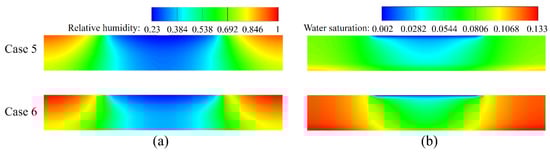 The above discussion reveals the common distribution features of both Case 5 and Case 6. Comparing the two through-plane PTFE doping schemes, it can be obviously observed that the relative humidity and the liquid saturation of Case 6 are higher than that of Case 5. On the one side, lower hydrophobicity of GDL near the GDL/MPL interface in Case 6 design makes the discharge of liquid water more difficult than Case 5 design. The liquid water content near the CL increases obviously for Case 6 as shown in Figure 7b. Under a higher temperature, the liquid water evaporates into water vapor leading to a higher water vapor content in MEA of Case 6 than that of Case 5. On the other hand, lower porosity of GDL near the GC/GDL interface will weaken the water vapor discharge by the strong forced convection in GC. Under these two favorable factors, more water vapor content finally leads to the increase of relative humidity as shown in Figure 7a. Higher relative humidity and liquid water saturation can improve water activity as shown in Equation (9), thus increasing the equilibrium water content. Large difference between local dissolved water content and equilibrium dissolved water content will drive water vapor transforming to the dissolved water and then improving the dissolved water content in the CL. Based on the above analysis, Case 6 design with a linearly increase PTFE content along the direction from GDL/MPL interface to the GC will strengthen the water retention of air-cooled fuel cells.